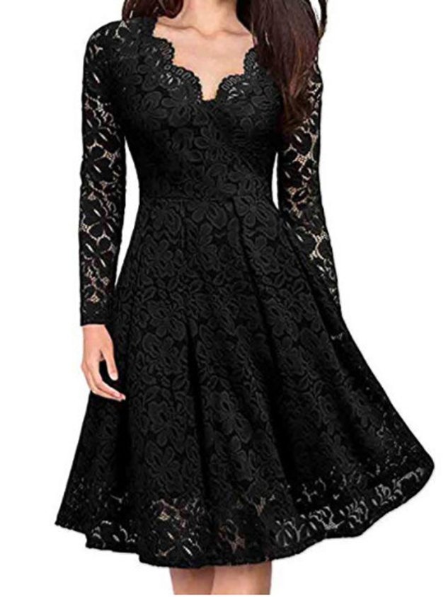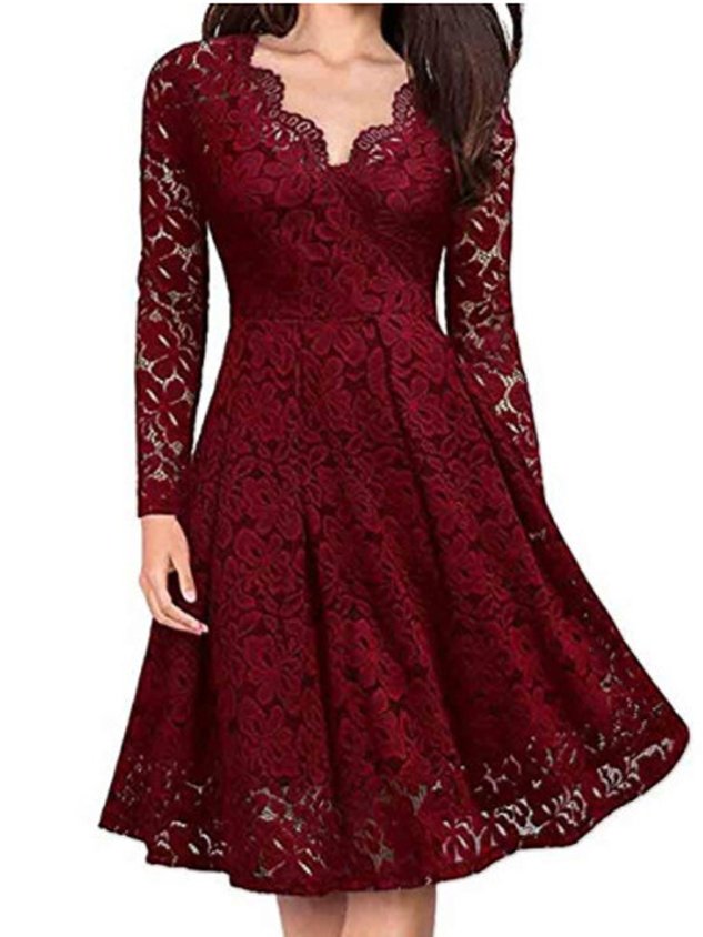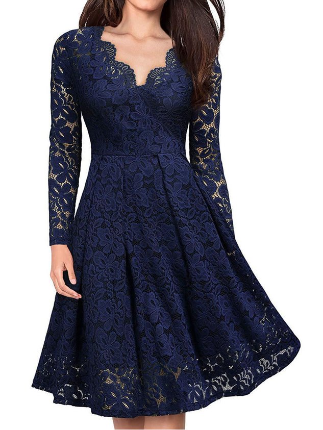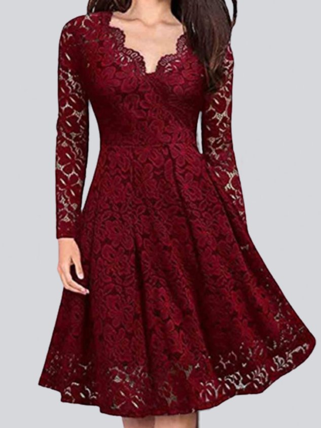Women Plain V Neck Long Sleeve Comfy Casual Lace Midi Dress