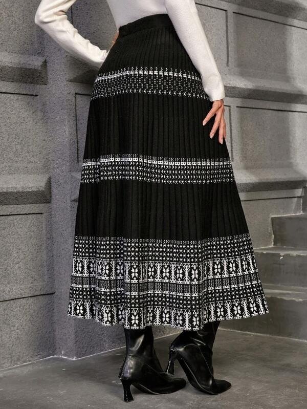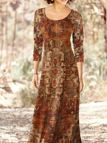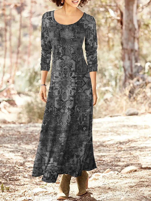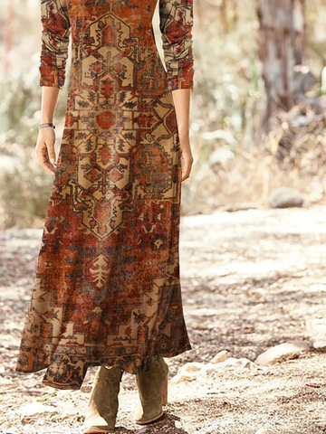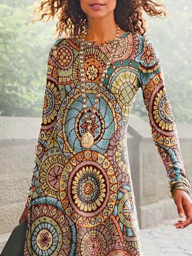 Ethnic Printed Long Sleeve Crew Neck Casual Dress