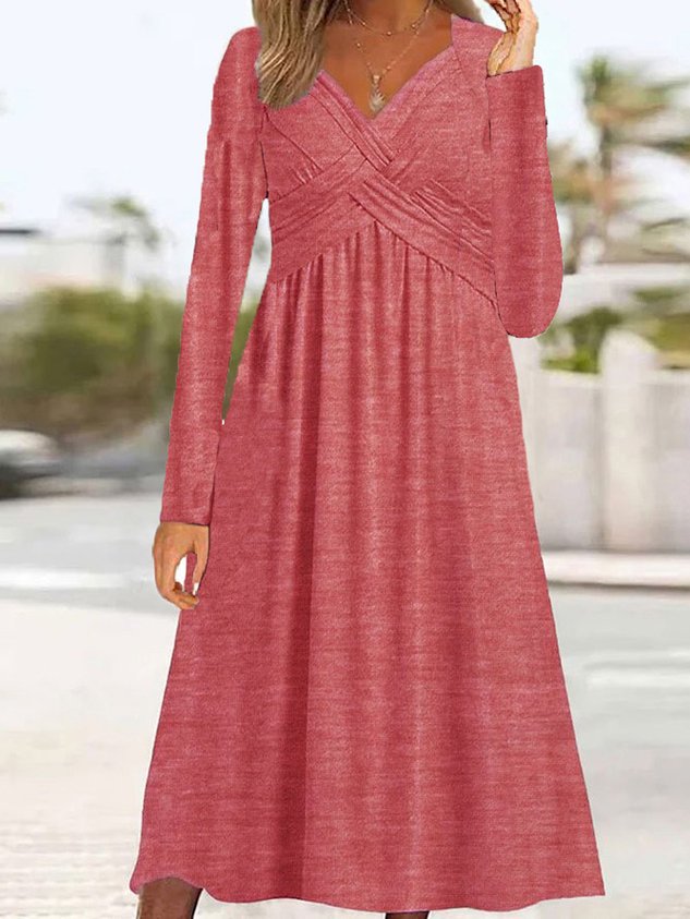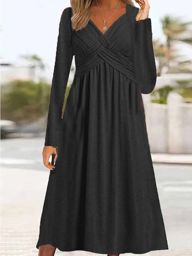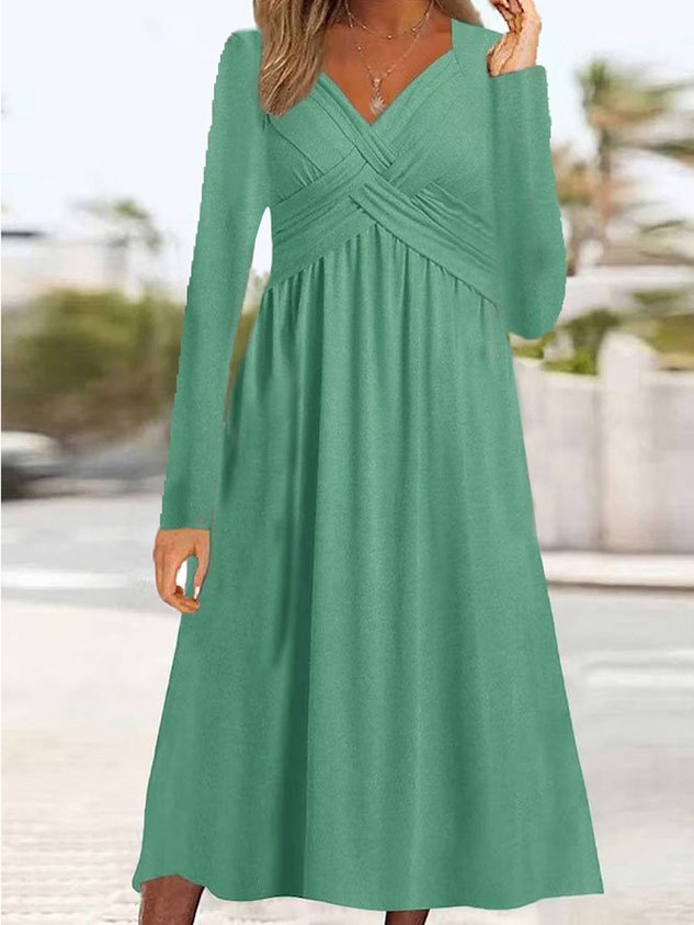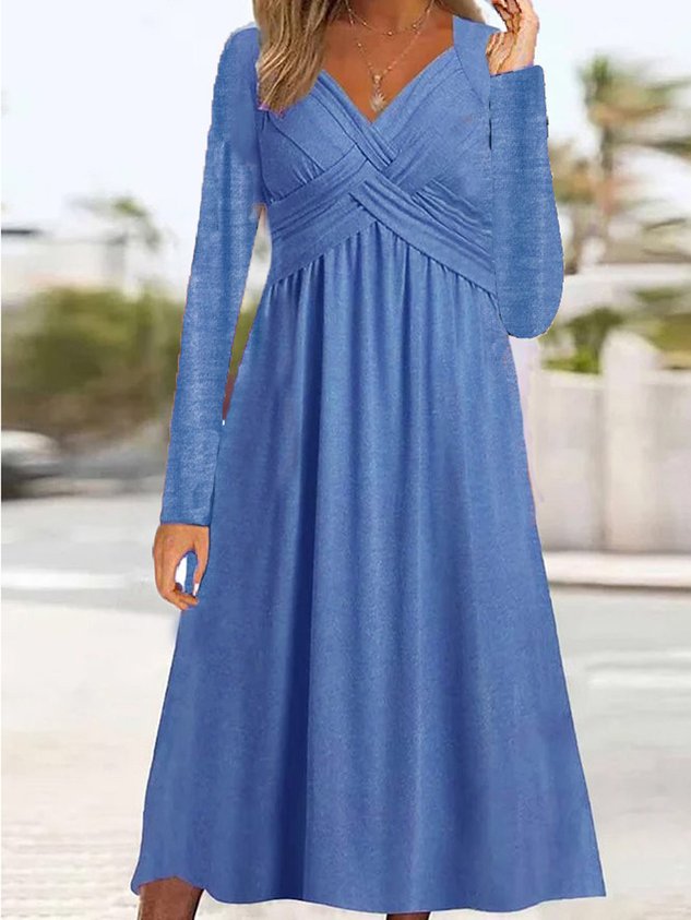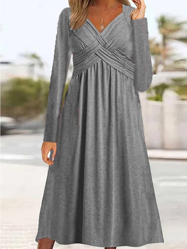 Women Plain V Neck Long Sleeve Comfy Casual Maxi Dress